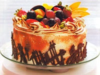 Bolo com Frutas 3 círculos de pão de ló cerca de 21cm de diâmetro (receita abaixo) calda (receita abaixo) chantilly para rechear morango kiwi pêssego abacaxi merengue italiano (receita abaixo) placas e copinhos de chocolate Modo de Preparo: Umedeça 1 círculo de pão-de-ló com a calda . Em seguida, espalhe bem o chantilly . Distribua as frutas picadas e faça outra camada de chantilly . Cubra com outro círculo de pão-de-ló e repita o procedimento do passo acima . Coloque o círculo restante por cima. Cubra o bolo na superfície e nas laterais com o merengue italiano, alisando bem . Em seguida, coloque o merengue num saco de confeitar com o bico que preferir e decore em volta da superfície, deixando o centro para as frutas . Queime o merengue com o maçarico. Decore o centro do bolo com frutas de sua preferência. Por cima, coloque os copinhos de chocolate e recheie com chantilly e com frutas. Por último, coloque as placas de chocolate nas laterais. Massa de Pão-de-ló Bata na batedeira 6 ovos com 180 g de açúcar até dobrar de volume, isto é, até que a massa fique bem clara. Transfira a massa para um bowl, e vá acrescentando 240 g de farinha de trigo, 60 g de leite com 7 g de óleo, alternadamente, em 3 vezes. Não manu¬seie muito a massa senão a farinha irá desenvolver o glúten, resultando numa massa "solada". Despeje a massa numa forma retangular de 30 cm x 40 cm, forrada com papel-manteiga. Alise bem e leve ao forno prea¬quecido a 200ºC por cerca de 12 minutos. Retire do forno, deixe esfriar e, somente depois retire o papel-manteiga. Corte o pão-de-ló no formato de¬sejado: circular, retangular. Calda Numa panela, ferva 300 g de água com 100 g de açúcar. Deixe esfriar, antes de usar. Plaquinhas de chocolate Derreta chocolate meio amargo em banho-maria. Em seguida, tempere o chocolate. Sobre uma folha de papel-manteiga, faça riscos irregulares com o chocolate, como se fosse uma "rede" e deixe endurecer. |
