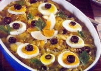 Arroz de Forno de Bacalhau Sobras de arroz Sobras de bacalhau ensopado 1 pimentão 2 ovos cozidos 1 colher (sopa) de cebola ralada 2 colheres (sopa) de óleo Como Preparar: Refogue a cebola no óleo e junte o pimentão cortado em tirinhas. Acrescente o bacalhau partido em lascas mais ou menos miúdas e o molho em que foi ensopado. Junte 3 colheradas de água fervente e o arroz. A base do bacalhau é de 1 xícara para 3 xícaras de arroz cozido. Deixe cozinhar tudo junto por alguns minutos, mas sem deixar secar. Aperte numa fôrma, desenforme numa travessa e enfeite por cima com rodelas de ovo cozido e azeitonas pretas. |