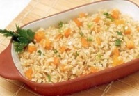 Arroz Integral à Grega - 1 colher (chá) de azeite de oliva - 1 cebola picada - 1 cenoura picada - 1 xícara (chá) de arroz integral cru lavado e escorrido - 1 tablete de caldo de galinha dissolvido em 2 xícaras (chá) de água - 1 colher (chá) de suco de limão - 2 colheres (sopa) de cebolinha verde picada Modo de Preparo Em uma panela, refogue, em fogo médio, o azeite com a cebola, a cenoura e o arroz. Adicione o caldo de galinha dissolvido em água. Quando começar a ferver, abaixe o fogo. Tampe a panela e deixe cozinhando por 45 minutos. Depois que toda água tiver secado, desligue o fogo e acrescente o suco de limão e a cebolinha picada. Sirva quente. |