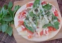 Pizza de Ricota - 2 pćes sķrios Recheio - 100 g de queijo ricota amassado - molho de tomate para pizza - 2 cebolas cortadas em rodelas - 1 ovo cozido - sal, pimenta-do-reino e orégano a gosto - 1 colher (sopa) de azeite - manjericćo Modo de Preparo Coloque os pćes numa assadeira passe o molho de tomate e distribua igualmente os ingredientes. Leve para assar por 10 minutos e sirva. |