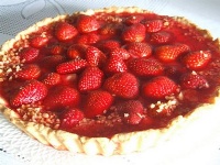 Torta de Morango 250 g de farinha de trigo; 250 g de açúcar; 200 g de manteiga; 04 ovos; 01 colher (sobremesa) de fermento em pó; 01 kg de morangos frescos; chantilly. Preparo: Bata a manteiga com o açúcar, até ficar um creme bem leve. Vá juntando os ovos, um a um, e continue a bater até a massa ficar bem leve e abrir bolhas. Acrescente a farinha de trigo, peneirado com o fermento. Mexa bem, e despeje numa fôrma redonda, alta, de 22cm de diâmetro untada com manteiga e polvilhada com farinha de trigo. Asse em forno médio. Quando começar a subir, cubra a fôrma com uma tampa, para que o bolo fique certinho em cima. Depois de assado, deixe esfriar, retire da fôrma e corte com uma faca, em 3 partes iguais. Modo de preparo: Arrume em um prato próprio de cristal ou vidro, da seguinte maneira: Lave bem os morangos e coloque-os em um pano para que absorva a água. Separe os maiores e os restantes, amasse com um garfo e adicione um pouco de açúcar. Coloque no prato uma fatia do bolo, recheie com a metade dos morangos amassados, fure com um garfo, para que fique bem úmido. Cubra com a outra fatia de bolo restante. Coloque na geladeira. Meia hora antes de servir cubra toda a torta com o creme chantilly, e enfeite com os morangos maiores. |