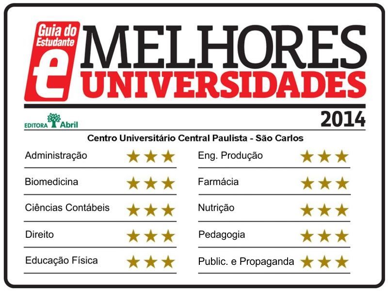 Administração, Biomedicina, Ciências Contábeis, Direito, Educação Física, Engenharia de Produção, Farmácia, Nutrição, Pedagogia e Publicidade e Propaganda da UNICEP receberam três estrelas na avaliação de cursos superiores, realizada pelo Guia do Estudante da Editora Abril e constarão na publicação do GE Profissões Vestibular 2015, que passarão a circular nas bancas, a partir do dia 10 de outubro. |