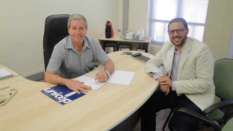 A formalização da parceria ocorreu nas dependências da ACISC, com a presença do presidente da entidade, José Fernando Domingues, e do diretor de pós-graduação e cursos de extensão da UNICEP, André Serotini.