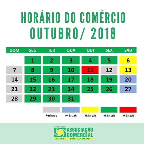 A ACISC (Associação Comercial e Industrial de São Carlos) informa o horário do comércio de rua - centro e bairros - para o mês de outubro, que terá horário especial nos dois primeiros sábados, dias 6 e 13, com lojas abertas das 9h às 17h.