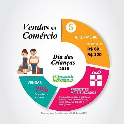 Levantamento realizado pela Associação Comercial e Industrial de São Carlos (ACISC), através de seu Núcleo de Economia, aponta um aumento de 7% nas vendas do Dia das Crianças em 2018. Já nas vendas no mês de outubro, se comparado com os meses anteriores de 2018, mostra um aumento de 10% nas vendas.