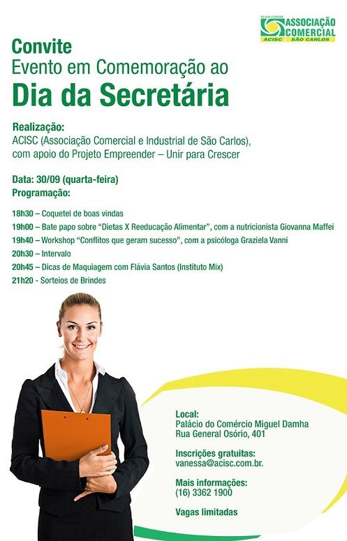 Para comemorar o Dia da Secretária (30 de Setembro), a ACISC (Associação Comercial e Industrial de São Carlos), com apoio do Projeto Empreender – Unir para Crescer e do Instituto Mix, realizará neste dia, a partir das 18h30, um evento especialmente para a referida categoria.
