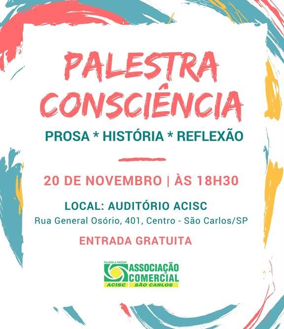 A Associação Comercial e Industrial de São Carlos (ACISC), realizará na próxima segunda-feira (20), a partir das 18h30, a palestra “Consciência: prosa, história e reflexão”. Evento é aberto ao público e será realizado no Auditório da ACISC.