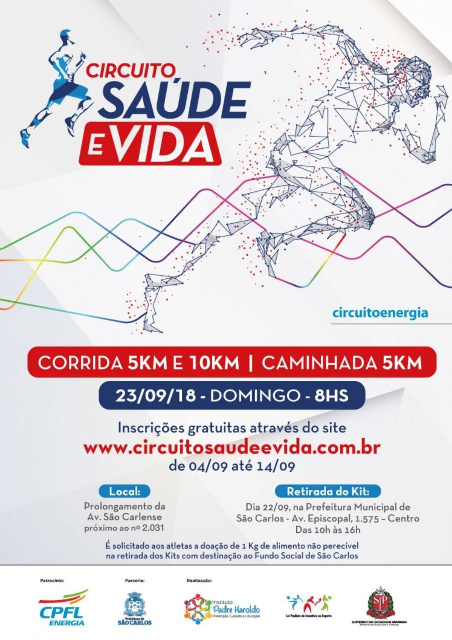 Será realizado no próximo dia 23 de setembro, em São Carlos, com organização do Instituto Padre Haroldo e CPFL e apoio da Prefeitura de São Carlos, por meio da Secretaria Municipal de Esportes e Lazer, o Circuito Saúde e Vida com percursos de 5 km (corrida ou caminhada) e 10 km (corrida).