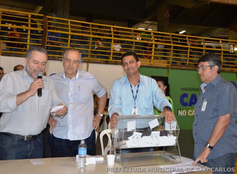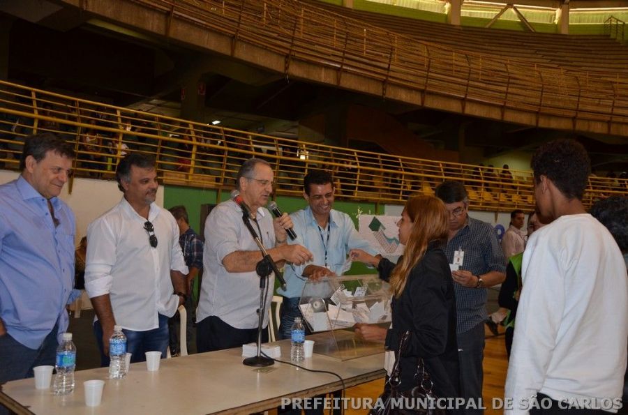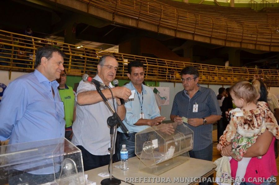 O Prefeito Paulo Altomani, acompanhado do diretor presidente da Progresso e Habitação (Prohab), Mauro Moraes e do diretor administrativo, José Luiz Galvão, realizou no último domingo (30), no Ginásio Milton Olaio Filho, o sorteio dos endereços das 806 casas do Residencial Planalto Verde, localizado no prolongamento da avenida Regit Arab, no Cidade Aracy.