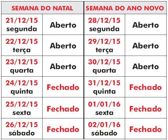 Nas semanas de Natal e Ano Novo, os postos Poupatempo funcionarão normalmente nas segundas, terças e quartas-feiras. Já nas quintas, sextas e sábados, dias 24, 25, 26 e 31 de dezembro e 1º e 2 de janeiro, as unidades estarão fechadas.