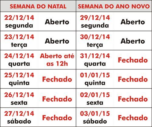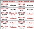 Já na quarta, 24/12, ficam abertos até as 12h. E na quarta, 31/12, e nas quintas, sextas e sábados, permanecem fechados.