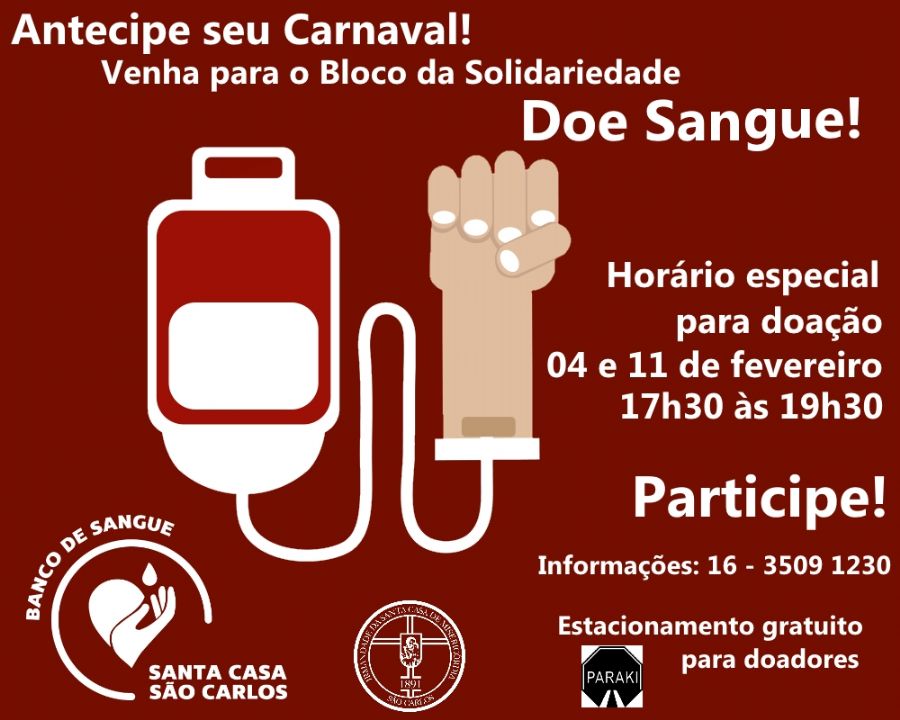 O Banco de Sangue da Santa Casa de São Carlos lança campanha para captar doação no pré-carnaval na tentativa de aumentar o estoque de bolsas sanguíneas. Nessa época do ano a demanda de bolsas sanguíneas cresce 10 % e o volume de doação baixa, aproximadamente, 15%, o que leva a uma ação para estimular a solidariedade do doador e a incentivar quem nunca colaborou a doar.