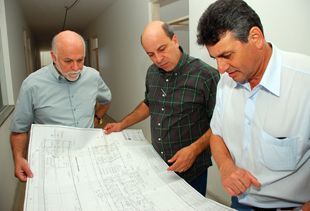 Os secretários Flávio Micheloni (Obras Públicas), Arthur Pereira (Saúde) e Leandro Severo (Comunicação) mostraram ao prefeito as repartições já construídas da unidade que está em fase final de revestimento interno e pintura e vai receber a implantação e adequações de paisagismo na área externa.