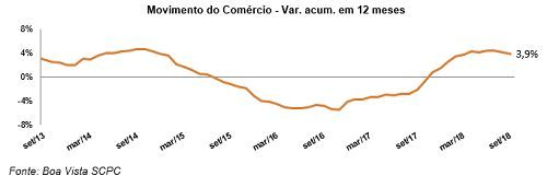 No acumulado em 12 meses, o indicador avançou 3,9% (outubro de 2017 até setembro de 2018 frente ao mesmo período do ano anterior). Já na avaliação contra setembro do ano anterior o varejo cresceu 2,7%.