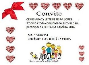 Neste sábado (13), o Centro Municipal de Educação Infantil (CEMEI) Aracy Leite Pereira Lopes, por meio da Secretaria de Educação, promove a tradicional Festa da Família. O evento que é aberto a toda a comunidade, acontece das 8 horas às 11 horas e a entrada é gratuita.