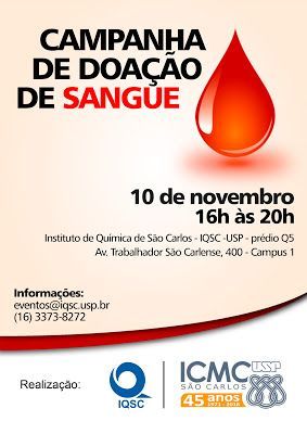 Estimular a doação de sangue é o objetivo da campanha que acontece no próximo dia 10 de novembro, quinta-feira, na USP em São Carlos. A iniciativa é resultado de uma parceira entre o Instituto de Ciências Matemáticas e de Computação (ICMC), o Instituto de Química de São Carlos (IQSC) e o Hemonúcleo Regional de Jaú, uma unidade do Hospital Amaral Carvalho.