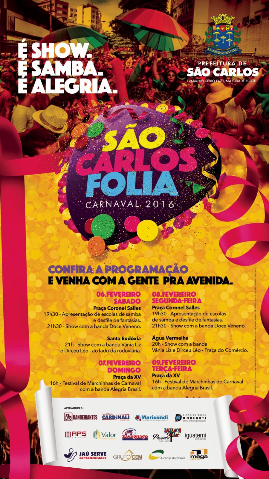 Na terça-feira (9), encerrando a programação de carnaval de São Carlos, nova apresentação da Banda Alegria Brasil, também das 15h às 19h, na Praça XV. “Temos que agradecer às empresas, à iniciativa privada, que entenderam a dificuldade financeira da Prefeitura e contribuíram decisivamente para a realização do carnaval. Sem o dinheiro das empresas que apoiaram não teríamos como fazer a festa”, agradeceu o prefeito Paulo Altomani.