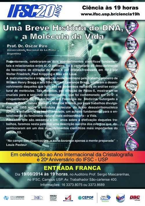 Uma Breve História do DNA, a Molécula da Vida. Esse é o tema do seminário que o Instituto de Física de São Carlos (IFSC) da USP promoverá na terça-feira, dia 19 de agosto, às 19 horas.