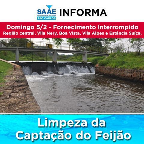 O Serviço Autônomo de Água e Esgoto (SAAE) de São Carlos informa que no próximo domingo, dia 5 de fevereiro, das 7h às 12h, a autarquia vai realizar a limpeza da Captação do Feijão, portanto o fornecimento de água na região central, incluindo Vila Nery, Boa Vista, Vila Alpes e Estância Suíça, será interrompido nesse período.