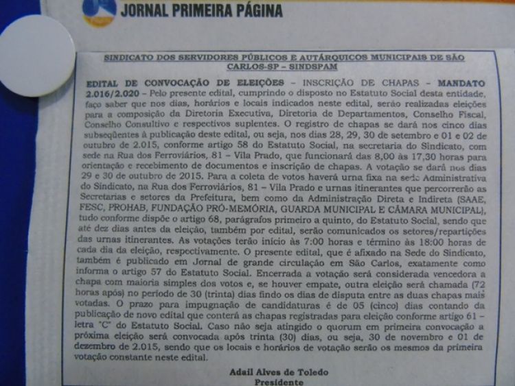 O Sindicato dos Servidores Públicos Municipais e Autárquicos de São Carlos (SINDSPAM), comunica a todos os interessados que estará realizando nos dias 29 e 30 de outubro de 2015 as eleições para composição da Diretoria Executiva, Diretoria de Departamentos, Conselho Fiscal, Conselho Consultivo e respectivos suplentes para o mandato 2016/2020.