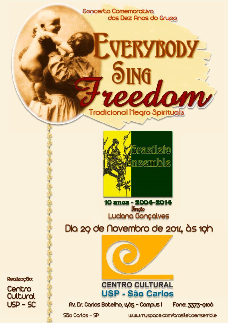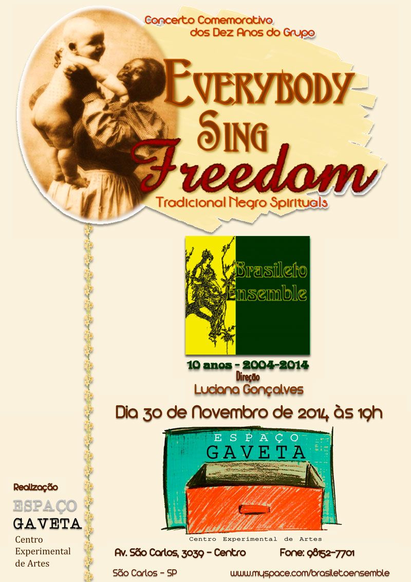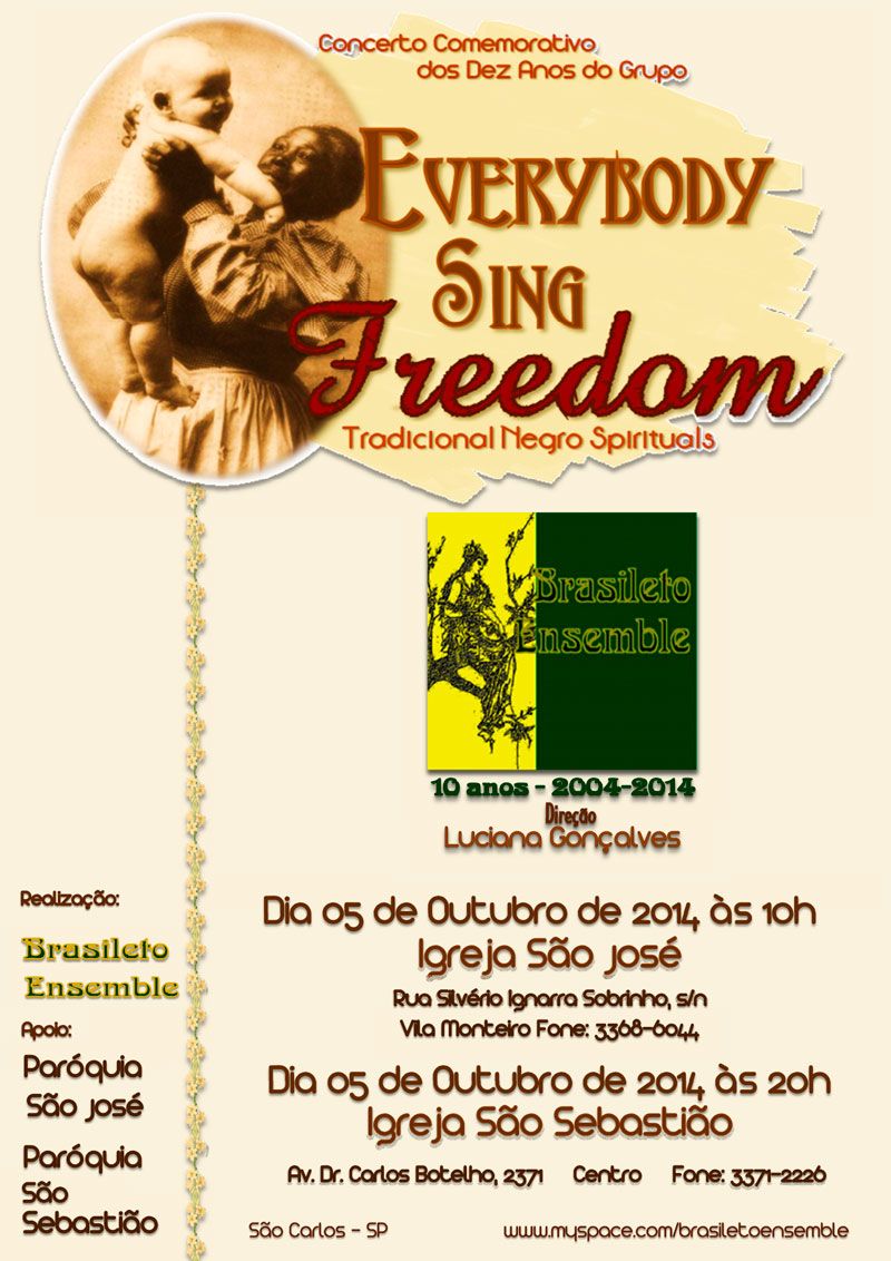 O grupo vocal Brasileto Ensemble completa dez anos de atividade neste ano de 2014. Para comemorar a data, escolhemos os negro spirituals como tema de nosso concerto. A escolha deste gênero musical tem como objetivo chamar a atenção para o crescente preconceito racial no mundo e relembrar o sofrimento dos escravos negros na América do Norte, como exemplo de conseqüência do preconceito. Para o logotipo do concerto foi escolhida foto antiga de uma senhora negra, escrava com um bebê branco e risonho nos braços, para mostrar que, quando nascemos, não temos preconceito algum.
