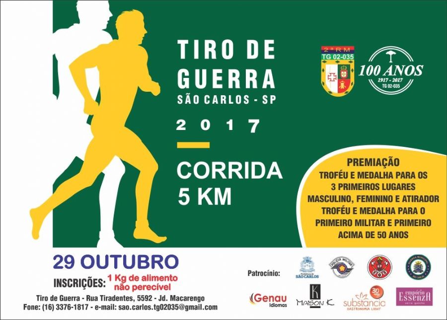 O Tiro de Guerra de São Carlos realizou no último domingo (29), uma corrida de 5 km. Apesar da forte chuva que caiu na hora do evento, muitas atletas participaram da competição que faz parte da programação em comemoração aos 100 da unidade, criada em outubro de 1917.