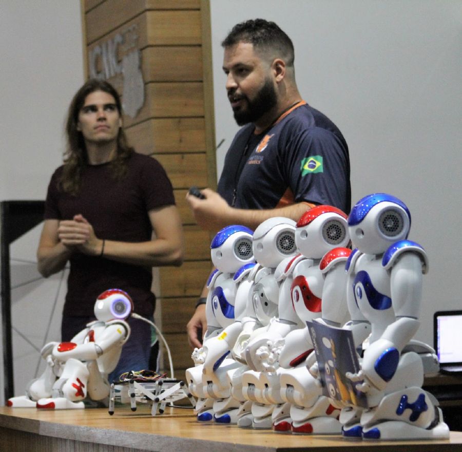 A seguir, o público entendeu as relações entre robótica e programação em um bate-papo descontraído com os doutorandos Adam Moreira e Daniel Tozadore, ambos do ICMC. Para isso, eles contaram com a ajuda de uma simpática família de robôs humanoides do Centro de Robótica de São Carlos (CROB). Um desses robôs, carinhosamente apelidado de Dolores, executou ao vivo alguns comandos digitados no computador por Daniel. As crianças vibraram quando Dolores dançou. Com essa demonstração, elas puderam conferir, ao vivo, que o comando para o robô precisa ser dado por um humano por meio de um computador.