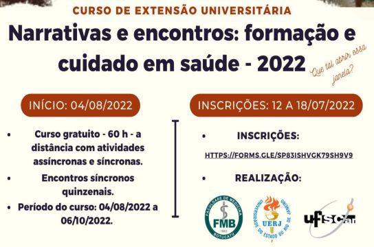 Estão abertas as inscrições para o curso de extensão "Narrativas e Encontros: formação e cuidado em Saúde", que visa fortalecer a competência narrativa de estudantes e profissionais, mediante a promoção do diálogo. Esta é a quarta edição da iniciativa que tem a proposta de aproximação com a arte, através da utilização de recursos literários e visuais. São ofertadas 60 vagas, os encontros serão em formato remoto e as inscrições podem ser feitas até 18 de julho.