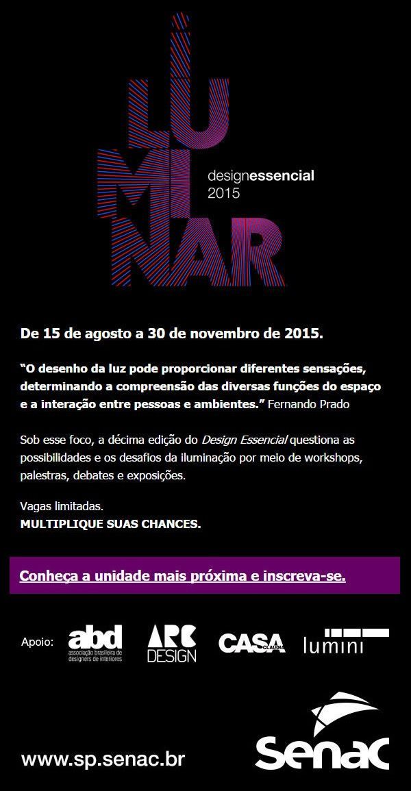 Entre 21 e 22 de outubro, o Senac São Carlos recebe a 10ª edição do Design Essencial, evento que apresenta tendências e inovações na área de design. A ação têm percorrido as unidades da instituição na capital e Grande São Paulo e interior do Estado e o tema para 2015 é Iluminar, discutindo a iluminação adequada para cada espaço.