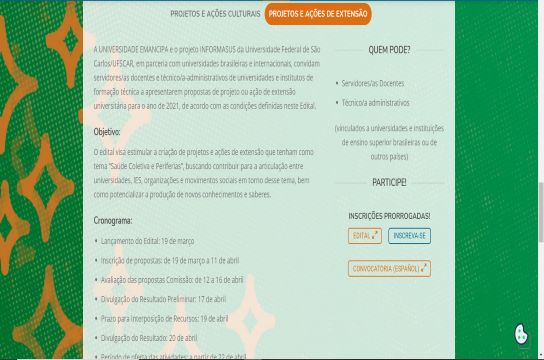 Estão abertas, até o dia 11 de abril, as inscrições no edital "Projetos e Ações de Extensão", ofertado no âmbito do curso "Saúde Coletiva e Periferias". O curso, que já conta com mais de 8 mil inscritos, é proposto pela parceria entre o InformaSUS da UFSCar, a Universidade Emancipa e mais de 20 instituições de Ensino Superior do Brasil e do mundo. As inscrições são gratuitas e a oportunidade é aberta a servidores docentes e técnico-administrativos de universidades e instituições de Ensino Superior (IES) brasileiras ou estrangeiras.