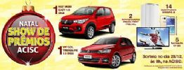 O sorteio da Promoção "Natal Show de Prêmios ACISC" será no dia 28/12, às 09h, na ACISC (Rua General Osório, 401, Centro). Mais informações podem ser obtidas pelo telefone: (16) 3362 1900.