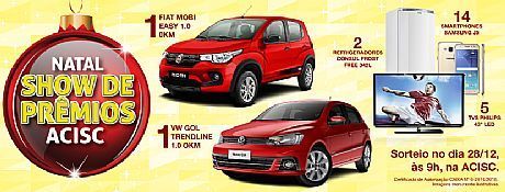 O cadastro das empresas sócias da ACISC é totalmente gratuito e permite que os clientes concorrem a: 1 Fiat Mobi Easy 0 Km, 1 VW Gol Trendline 0 Km, 14 Smartphones Sansung J5, 5 TV´s Philips 43'' LED e 2 Refrigeradores Consul Frost Free 342 litros.