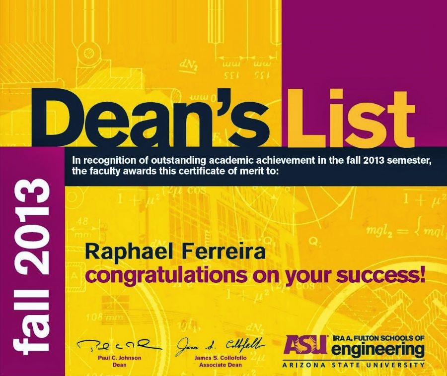 No início de janeiro, a Escola de Engenharia da Universidade Estadual do Arizona (Arizona State University - ASU), nos Estados Unidos, homenageou Raphael Victor Ferreira, aluno do 3º ano de Engenharia de Computação, curso que é oferecido em conjunto pelo Instituto de Ciências Matemáticas e de Computação (ICMC) da USP, em São Carlos, e pela Escola de Engenharia de São Carlos (EESC). Ele está nos EUA desde junho de 2013 por meio do Programa Ciência sem Fronteiras e recebeu um certificado ao mérito que é oferecido aos alunos que demonstram excelência durante o semestre acadêmico (Dean"s List).