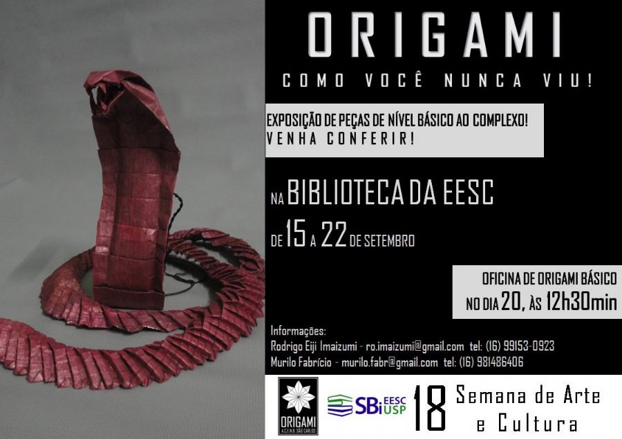 Convidamos a todos para visitar a exposição de ”Origami como você nunca viu”, de Rodrigo Eiji Imaizumi e Murilo Fabrício. Haverá uma OFICINA DE ORIGAMI, no dia 20/09 às 12h30min, interessados em participar entrem em contato pelo e-mail ro.imaizumi@gmail.com