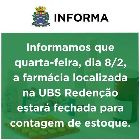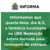 A Secretaria Municipal de Saúde comunica que nesta quarta-feira (8), a farmácia da Unidade Básica de Saúde (UBS) Redenção, localizada rua Desembargador Júlio de Faria, nº 1.700, não estará aberta para dispensação de medicamentos aos usuários do Sistema Único de Saúde (SUS). O motivo é a contagem de estoque, procedimento necessário para que o sistema seja informatizado.