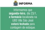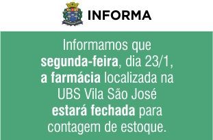 A Secretaria Municipal de Saúde comunica que na próxima segunda-feira (23), a farmácia da Unidade Básica de Saúde (UBS) Vila São José, localizada na avenida Araraquara, 422, não estará aberta para dispensação de medicamentos aos usuários do Sistema Único de Saúde (SUS).
