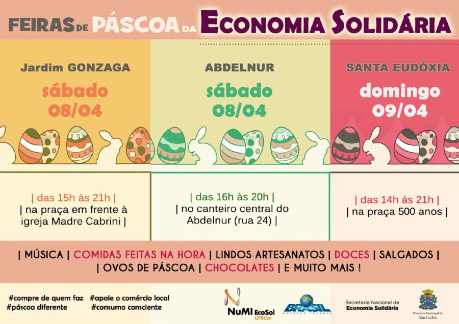 Nos próximo fim de semana, dias 8 e 9 de abril, o Jardim Gonzaga, Cidade Aracy e o distrito de Santa Eudóxia recebem as feiras especiais de Páscoa, com a venda de produtos relacionados a data, como ovos de chocolate simples e trufados.