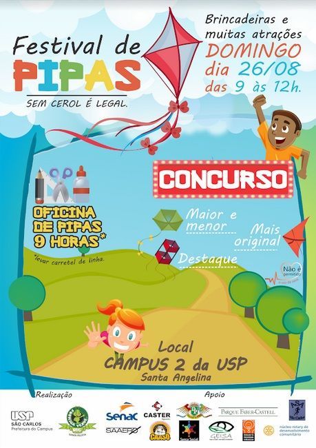 No próximo domingo, dia 26, entre 9 e 12 horas, será realizado o Festival de Pipas 2018 na Área 2 do Campus da USP em São Carlos. O evento é promovido pela Prefeitura do Campus USP de São Carlos (PUSP-SC), por meio da Comissão Interna para Gestão da Qualidade e Produtividade – Comissão Inclusão Social, em parceria com a Organização Não Governamental (ONG) Formiga Verde.