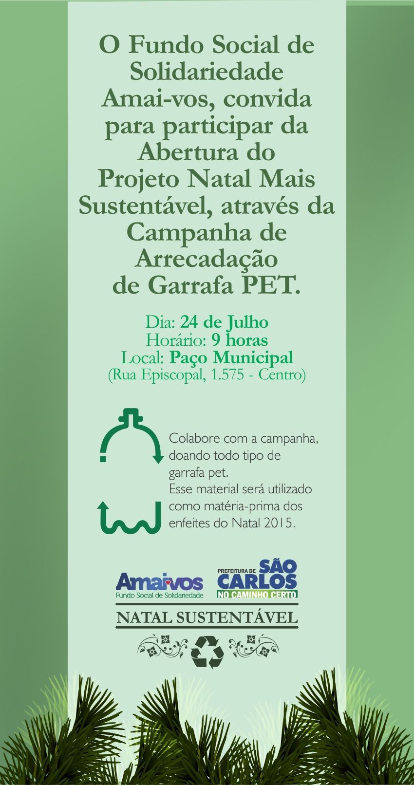 O Fundo Solidariedade “Amai-vos” realiza o lançamento do projeto “Natal Mais Sustentável”, na próxima sexta-feira (24), às 9h, no auditório do Paço Municipal. O objetivo é arrecadar garrafas PET e transformá-las em itens de decoração natalina.