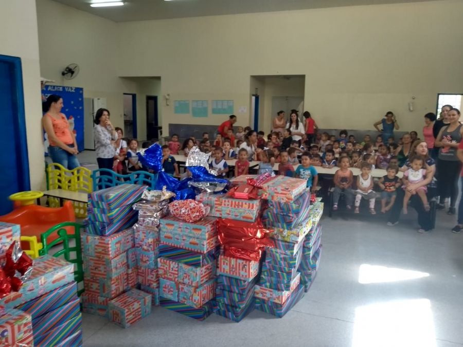 A CEMEI atende crianças de 0 a 3 anos. Todas as crianças receberam um presente.