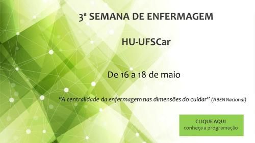 De 16 a 18 de maio de 2018, o Hospital Universitário da UFSCar promove a sua terceira edição da Semana de Enfermagem. Estão previstas palestras direcionadas aos profissionais da área e abertas ao público interno e externo.