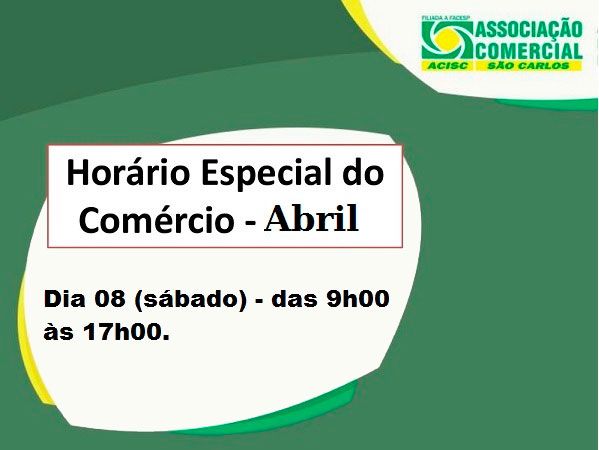 A ACISC (Associação Comercial e Industrial de São Carlos) informa o Horário Especial do Comércio no mês de Abril de 2017: