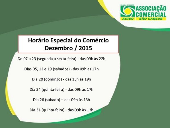 Para facilitar a compra dos presentes de final de ano, a ACISC (Associação Comercial e Industrial de São Carlos) informa o Horário Especial do Comércio para o mês de dezembro, definido pelos sindicatos da categoria: até o dia 23 (de segunda a sexta-feira), as lojas permanecem abertas das 09h às 22h; no sábado (19), das 09h às 17h, e no domingo (20), das 13h às 19h.
