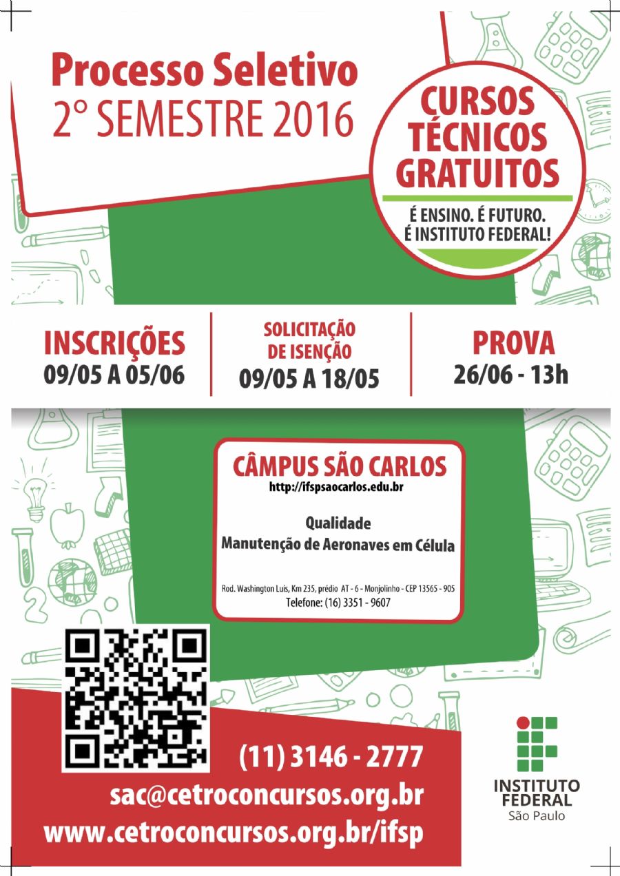 No Câmpus São Carlos estão sendo oferecidas 80 vagas, para os cursos Técnico em Qualidade e Técnico em Manutenção de Aeronaves em Célula. A prova para todos os cursos será realizada no dia 26 de junho, às 13h, e contará com 50 questões de múltipla escolha. A inscrição custa R$20, e deverá ser realizada até o dia 05 de junho de 2016.