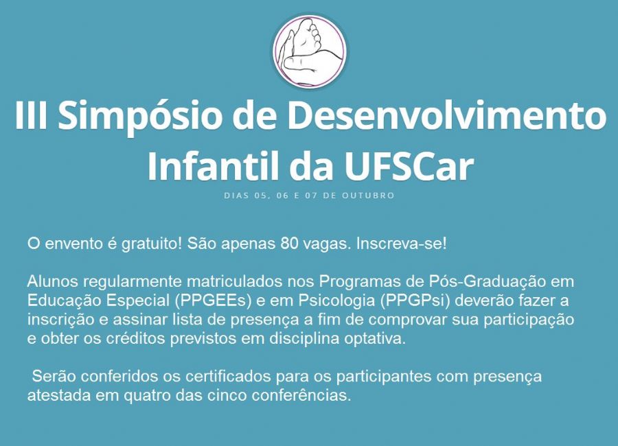 O Laboratório de Interação Social (LIS) da UFSCar, com o apoio dos Programas de Pós-Graduação em Psicologia (PPGPsi) e em Educação Especial (PPGEEs) e do Instituto Nacional de Ciência e Tecnologia sobre Comportamento, Cognição e Ensino (INCT-ECCE), realiza o III Simpósio Internacional de Desenvolvimento Infantil.