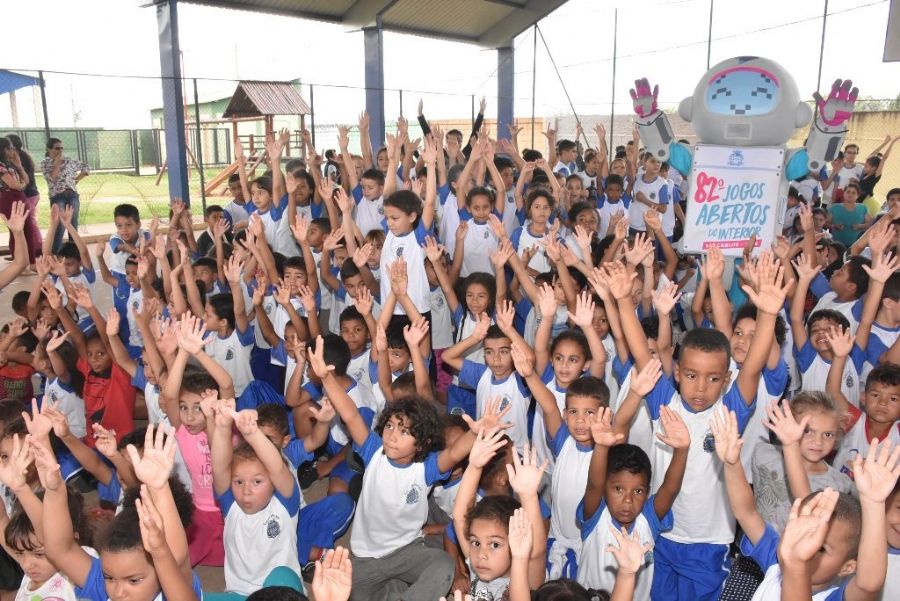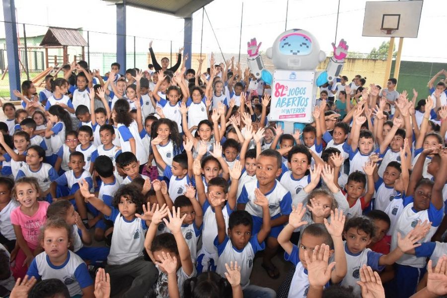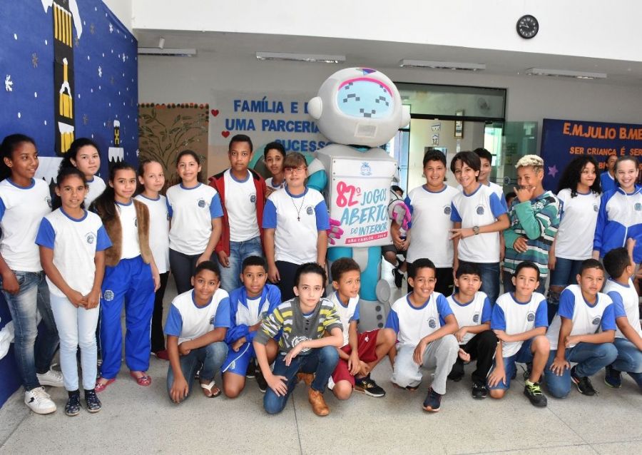 A robozinha Babi visitou Ibaté nessa segunda-feira (12) e encantou centenas de crianças em duas escolas municipais. A primeira parada foi por volta das 10h30 na Escola Júlio Benedito Mendes que atende 240 alunos de 8 a 11 anos, do 3º ao 5º anos, nos turnos da manhã e tarde, no centro da cidade. Babi foi recebida pelo diretor da escola, Alexandre Gaspar, diversas professoras e também pelo vice-prefeito, Horácio Carmo Sanchez. Durante cerca de 40 minutos a robô e monitores fizeram algumas atividades com as crianças que tiveram um começo de semana na escola que, com certeza, vai ficar na memória. De acordo com o diretor, “esse momento é mágico para esses meninos e meninas, ao mesmo tempo em que desperta o interesse pelos Jogos e divulga as atividades em casa, junto à família e amigos”.