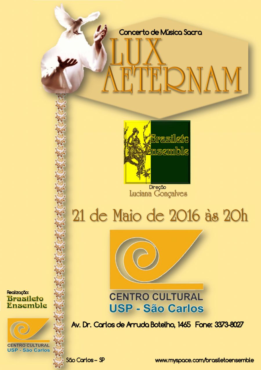 O grupo vocal Brasileto Ensemble apresenta seu Concerto de Música Sacra “Lux Aeternam”, cujo tema trata das Páscoas judaica e cristã. O concerto, que já teve quatro apresentações na cidade de São Carlos e Rio Claro, será realizado em suas últimas apresentações em São Carlos (SP) nos dias 21/05 (Sábado) às 20h no Centro Cultural da USP e em Jaú (SP), no dia 29/05 (Domingo) às 11h na Igreja Nossa Senhora do Patrocínio.