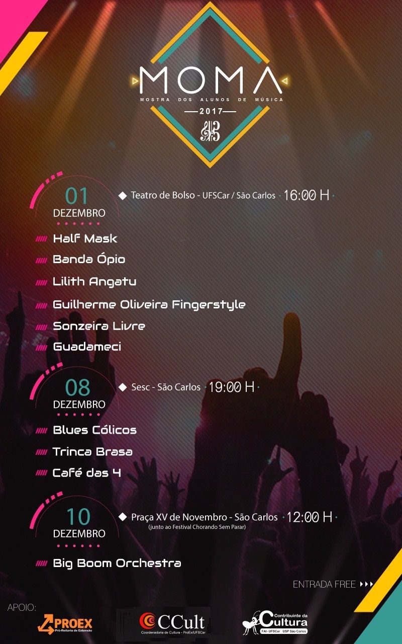 Em sua sétima edição, começa nesta sexta-feira (1/12) a Mostra Musical dos Alunos do Curso de Música (MoMA) da Universidade Federal de São Carlos (UFSCar), com apresentações de grupos formados por estudantes do curso de Licenciatura em Música da Universidade. Diversidade, experimentação, criatividade, novas sonoridades e novas "roupagens" para antigas músicas, propostas de integração e de inclusão social são algumas das características das bandas que se apresentaram nas edições anteriores do evento.
