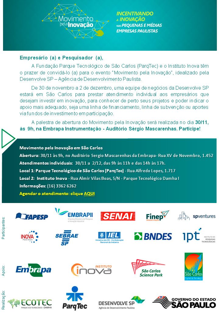 A Desenvolve SP - Agência de Desenvolvimento Paulista retorna a São Carlos com o Movimento pela Inovação, o evento contará com palestras e atendimentos individuais para empresários e pesquisadores. O objetivo é incentivar o investimento à inovação nas pequenas e médias empresas. Depois de ser a primeira a receber o evento em 2015, a cidade encerrará as atividades deste ano.