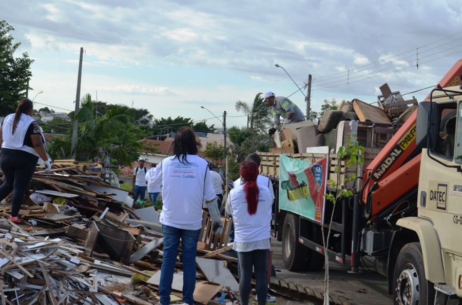 Desta vez as ações de limpeza se concentraram no ecoponto do Santa Angelina, que estava com muito entulho e inservíveis, extrapolando a área delimitada para o uso; no campo de futebol ao lado, onde também a população está descartando todo tipo de material e no ecoponto do Jardim Ipanema, local que também estava com acúmulo de descarte irregular.